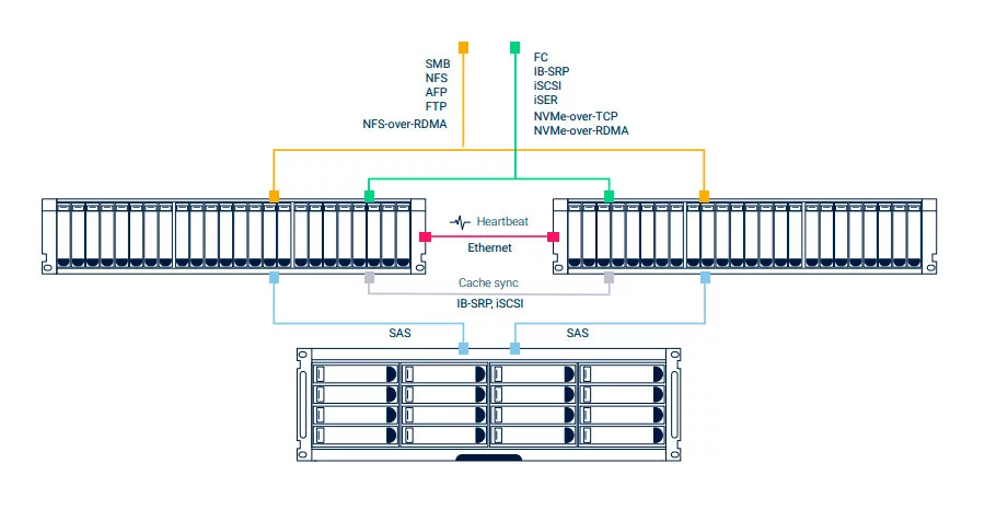 Взаимодействие контроллеров системы осуществляется по протоколам Ethernet, InfiniBand, iSCSI, что позволяет синхронизировать состояния контроллеров и кэша.