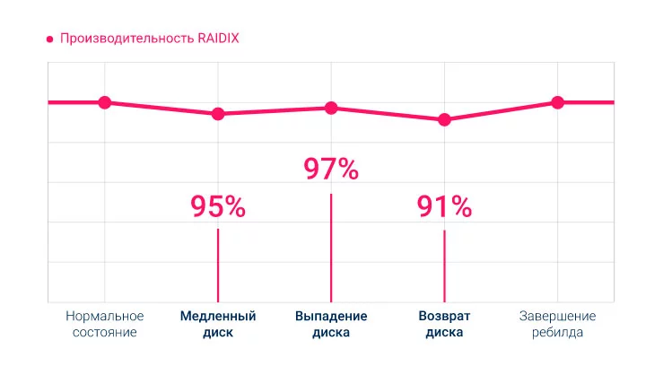 Инновационные технологии RAID-массива минимизируют просадку производительности при отказе одного или нескольких дисков. Это позволяет сохранить стабильность работы приложений и целостность передаваемых данных при аварийных ситуациях.