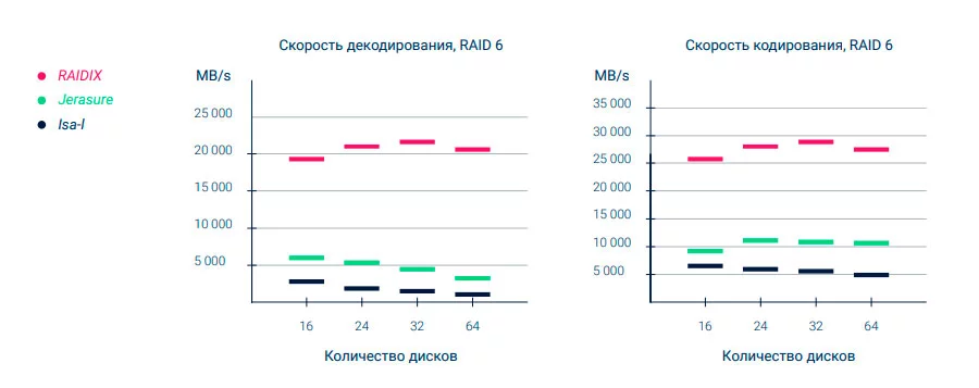 Особая архитектура программного массива RAIDIX позволяет добиваться максимальной производительности на HDD в условиях интенсивной потоковой нагрузки. Это дает существенное преимущество в скорости выполнения задач даже для небольших СХД начального уровня.