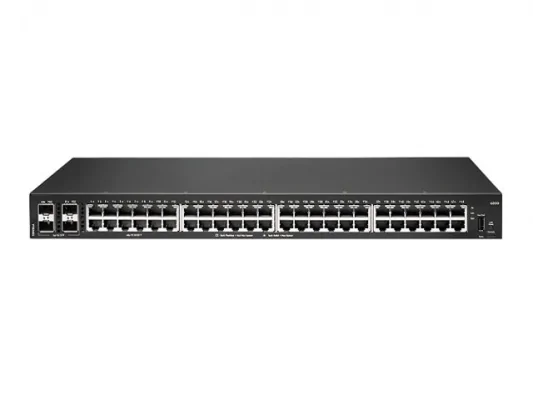- Порты. В максимальном развитии устройство имеет 48 портов Gigabit Ethernet (10/100/1000BASE-T) для подключения проводных устройств, а также 4 слота SFP для оптоволоконных соединений 1 Гбит/с, что обеспечивает гибкость в построении сетевой инфраструктуры.